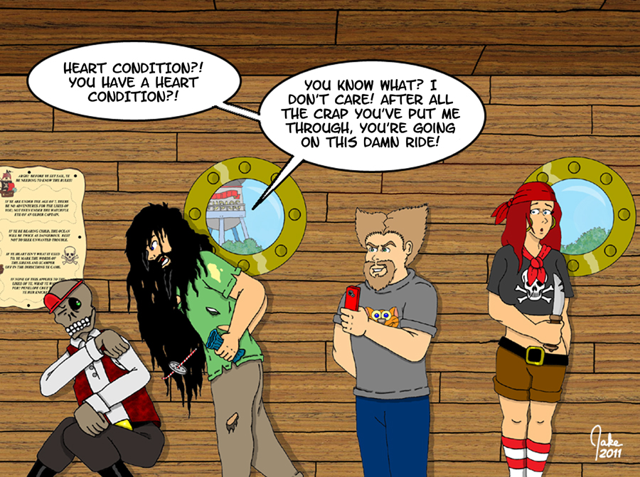 After nine years and four different movies, it was obvious from the start what our homage to "On Stranger Tides" was going to be. The on-going saga of Erik and Crispie waiting patiently in line to go on an amusement ride still had plenty of potential left. So when I sat down and drew it, I didn't have to think much about it. Why? Well, as foolish as it sounds, this series of illustrations developed its own continuity. It developed a progression to where the story is going (or as Robert McGee would say "a narrative thread where the characters are dictating their actions outside of the author's involvement".) It really was, for lack of a better term, a no-brainer.