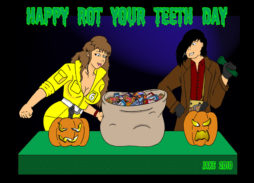 As you can probably tell, I was still a little rusty. Certain parts had to be redone (a leg here, an arm there) and there was a ton of photoshopping to be had. Originally Erik and Kari were going to be surrounded by other members of the cast but I couldn't get the perspective right. And as much work I spent drawing the wrappers to various candy bars, they didn't come out better than the real things (although I did enjoy eating the 'references'). So on October 30th at 8:35 PM I decided to just go with what was clicking and not look back.