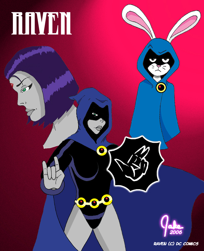 Although the purists might chew me out, I really don't care for the character's comic book costume. There's just something about it that seems off-kilter to me, not to mention ugly. Yeah, I said it. I apologize but it's true. So when Raven came up as one of the characters I was asked to draw, I knew right away I'd be going for her better and more styish animated counterpart. And let me tell you, it was a blast! So much so that this picture is actually a combination of three different sketches I did. It might have affected the quality of the picture overall, but I think it still came out quite nicely. - Jake