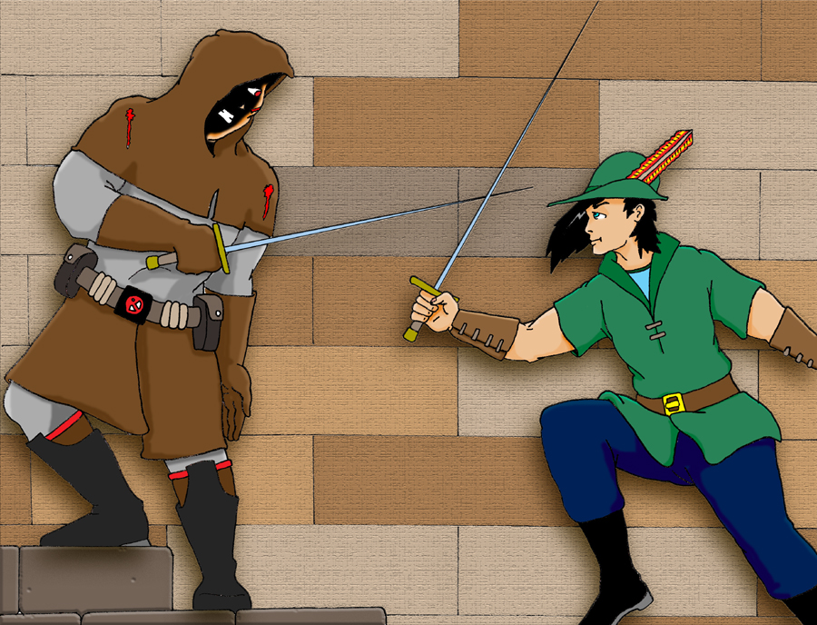 No matter what I came up with, be it jokes about Kevin Cosner or a homage to Daffy Duck (who I think is a better Robin Hood than Russell Crowe. Yeah, I went there!), I kept coming back to images of Erroll Flynn's version in my head. So eventually I accepted the truth and knew the only thing I could do would be taking a scene from that film and implementing Erik into it. And what better moment than Robin's thrilling swordfight with Sir Guy of Gisbourne on the steps of Prince John's castle.