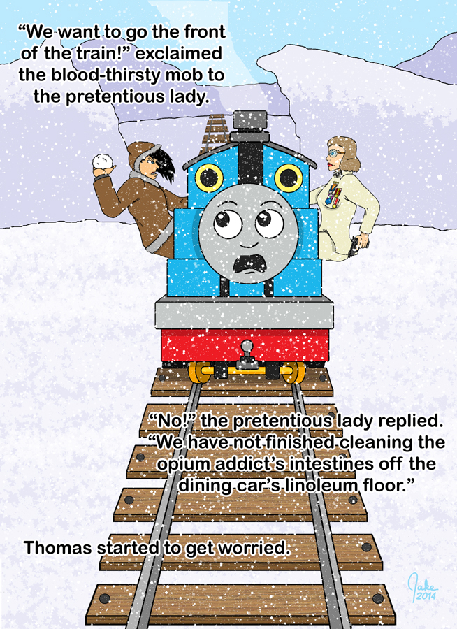 Interesting post-note: Nearly a year after I debuted this illustration, Marvel Studios released the movie "Ant-Man" in theaters. In a humorous case of coincidence, the climax featured Ant-Man facing off against his arch-nemesis Yellowjacket, both miniaturized, fighting aboard a Thomas the Tank Engine train set. I guess great minds think alike. - Jake